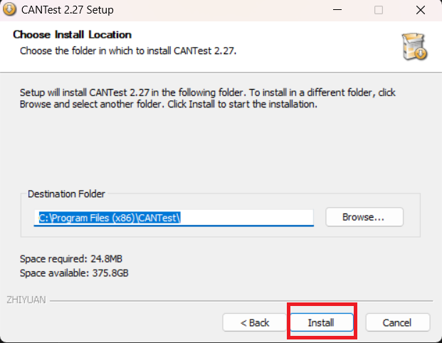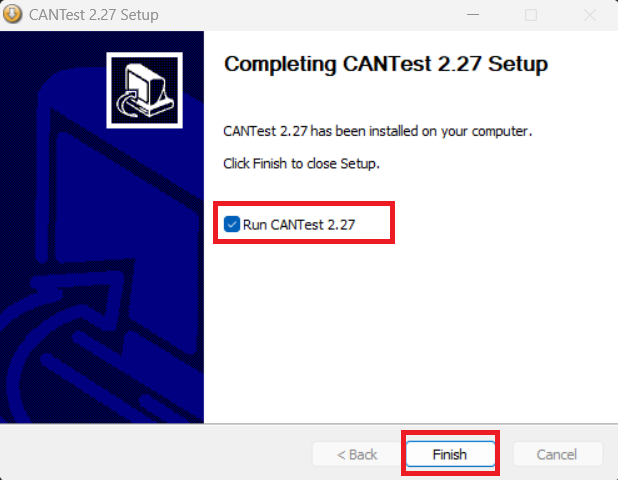 When the installation is complete, deselect the checkmark located next to the ‘Run CANTest 2.27’ option.