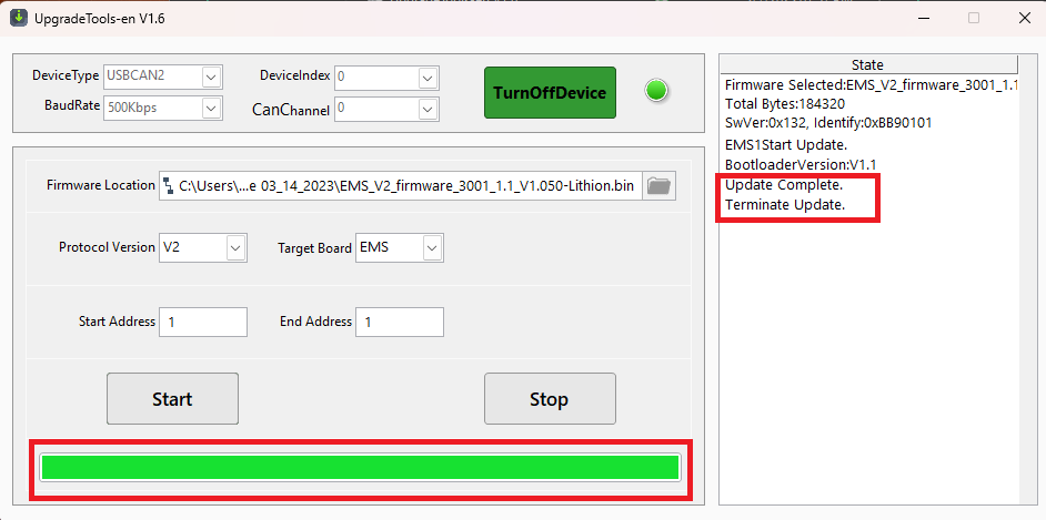 Next, you will make the necessary settings changes for the type of firmware that you’re updating. For BMS Display firmware updates, change the ‘Protocol Version’ and ‘Target Board’ drop-down menu options to ‘V2’ and ‘EMS’, then press ‘Start’ to initiate the firmware update of BMS Display.