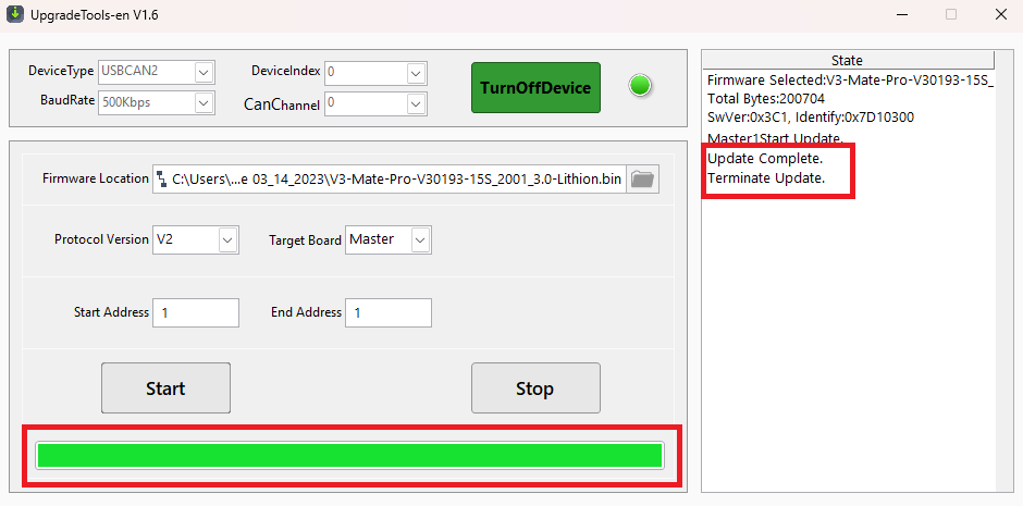 Before pressing ‘Start’, make the necessary changes to the ‘Protocol Version’ and ‘Target Board’ drop-down menus by selecting ‘V2’ and ‘Master’. Press ‘Start’ to initiate the firmware update of the BMS Controller.