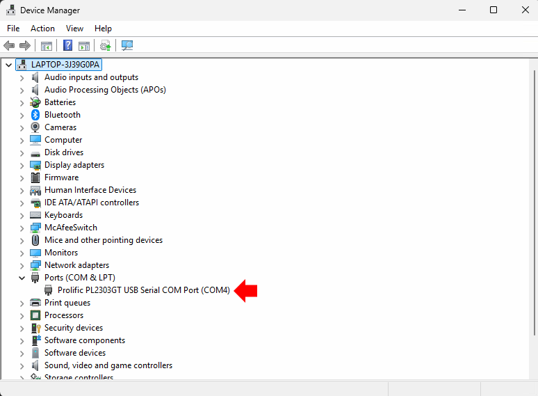 Note: If there are multiple COM port options, navigate to device manager and check under ports for Prolific PL2303GT USB Serial COM Port. If you do not see this, the laptop either hasn't recognized the cable or the drivers have not been properly installed.