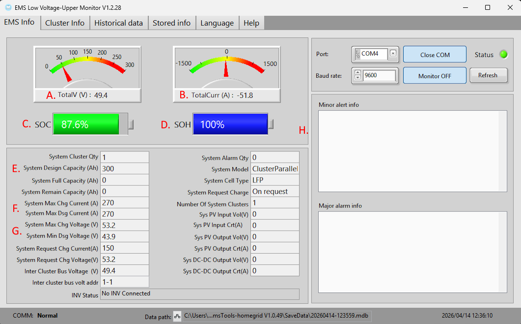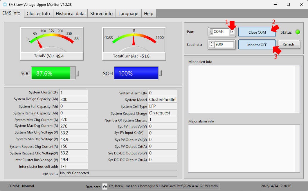 2. This will bring you into 'EMS Low Voltage Upper Monitor v1.2.28'. To start reading the data from the unit, you will need to do the following: