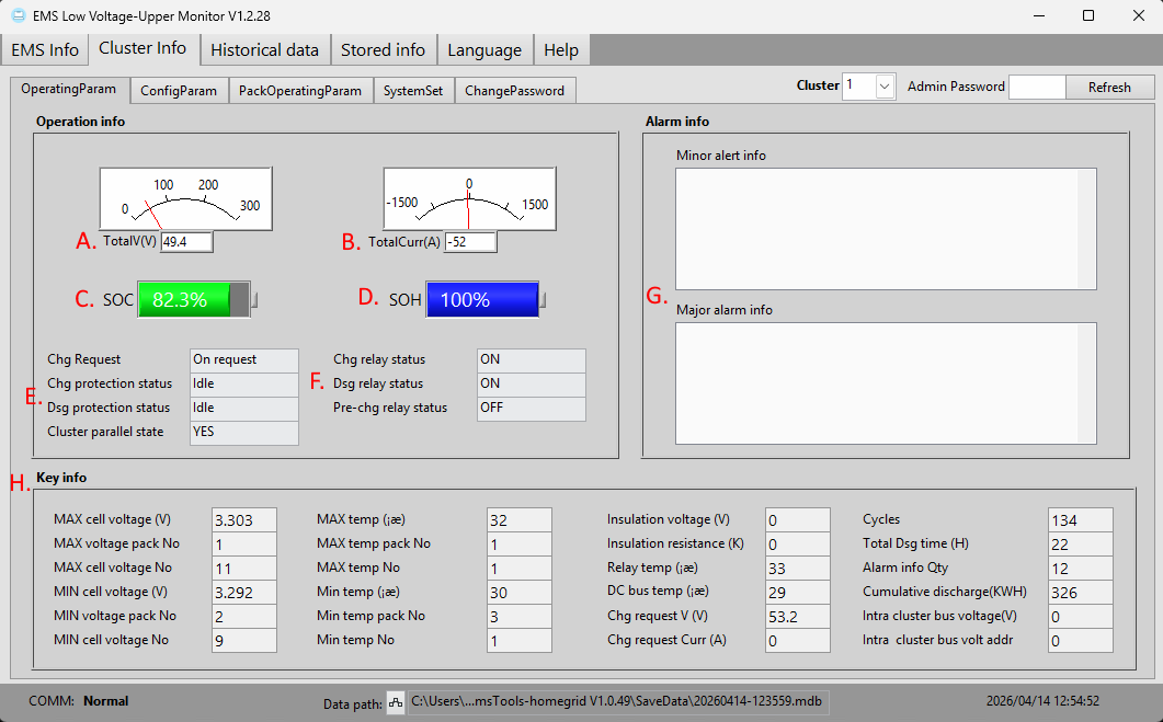 | H. | Remaining Capacity (Ah) | This will display the amount of capacity remaining in the battery stack. |