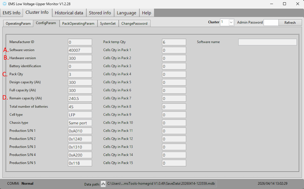 | A. | BMS Software Version | This will display the current software version of the main control board within the BMS. |