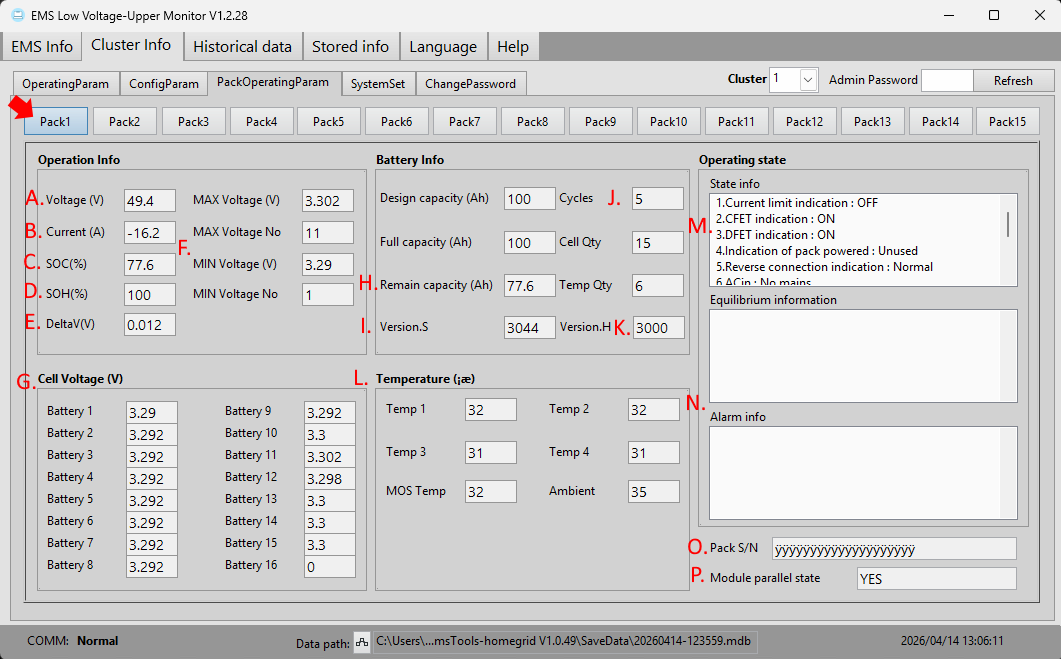 | O. | Pack S/N | This serial number should match the serial number under the barcode on the battery module's silver sticker. |